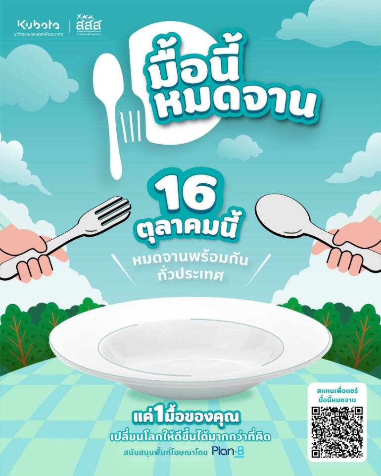 สยามคูโบต้า และ สสส.ชวนคนไทยทั้งประเทศร่วมกิจกรรม “มื้อนี้หมดจาน” สร้างวัฒนธรรมกินอาหารให้หมดจานในวันที่ 16 ต.ค.68 ในวันอาหารโลก เพื่อลดขยะอาหาร และสนับสนุนการทำเกษตรที่ยั่งยืน ลดการปล่อยคาร์บอนไดออกไซด์และมีเทน ต้นเหตุของก๊าซเรือนกระจกทำโลกร้อน