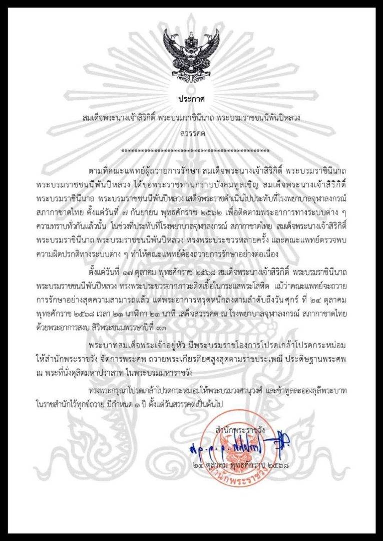 ประกาศ สมเด็จพระนางเจ้าสิริกิติ์ พระบรมราชินีนาถ พระบรมราชชนนีพันปีหลวง สวรรคต