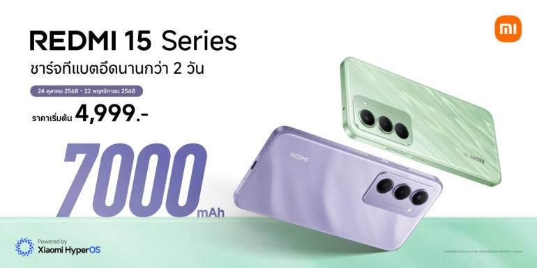 เมื่อวันที่ 24 ต.ค.2568 ที่ผ่านมา เสียวหมี่ ประเทศไทย ประกาศวางจำหน่ายสมาร์ทโฟนรุ่นใหม่ REDMI 15 Series สองรุ่น ได้แก่ REDMI 15 และ REDMI 15 5G ขับเคลื่อนบนระบบปฏิบัติการ Xiaomi HyperOS 21 โดยเป็นผลิตภัณฑ์สมาร์ทโฟนที่เน้นความคุ้มค่า ที่ถูกออกแบบมาเพื่อการใช้งานที่เสถียร และใช้งานได้ตลอดวัน รวมไปถึงตอบสนองความบันเทิงในชีวิตประจำวันอีกด้วย โดยราคาเริ่มต้นจับต้องได้เพียง 4,999 บาท
