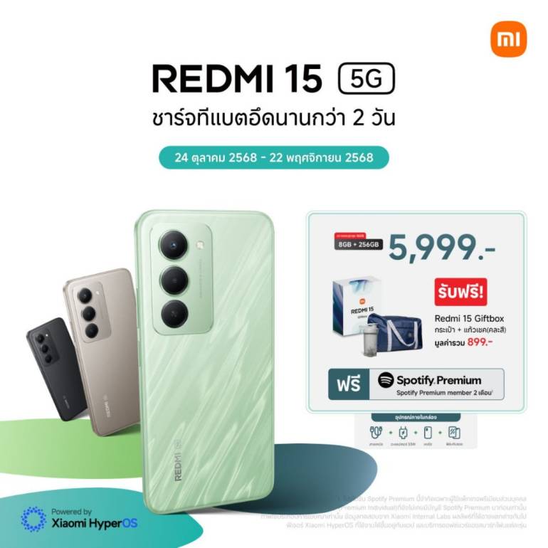 REDMI 15 5G รุ่นความจุ 8GB + 256GB มีให้เลือก 3 สี ได้แก่ Ripple Green, Titan Gray และ Midnight Black2 วางจำหน่ายในราคา 5,999 บาท ที่ Xiaomi Store, ร้านตัวแทนจำหน่ายที่ร่วมรายการทั่วประเทศ และช่องทางการจัดจำหน่ายทางออนไลน์ พิเศษ! เมื่อซื้อ REDMI 15 5G ระหว่างวันที่ 24 ตุลาคม 2568 - 22 พฤศจิกายน 2568 รับฟรี REDMI 15 Giftbox กระเป๋าและแก้วเชคคละสีมูลค่ารวม 899 บาท และฟรี! Spotify Premium member 2 เดือนเฉพาะผู้ใช้แพ็กเกจพรีเมียมส่วนบุคคล (Premium Individual)