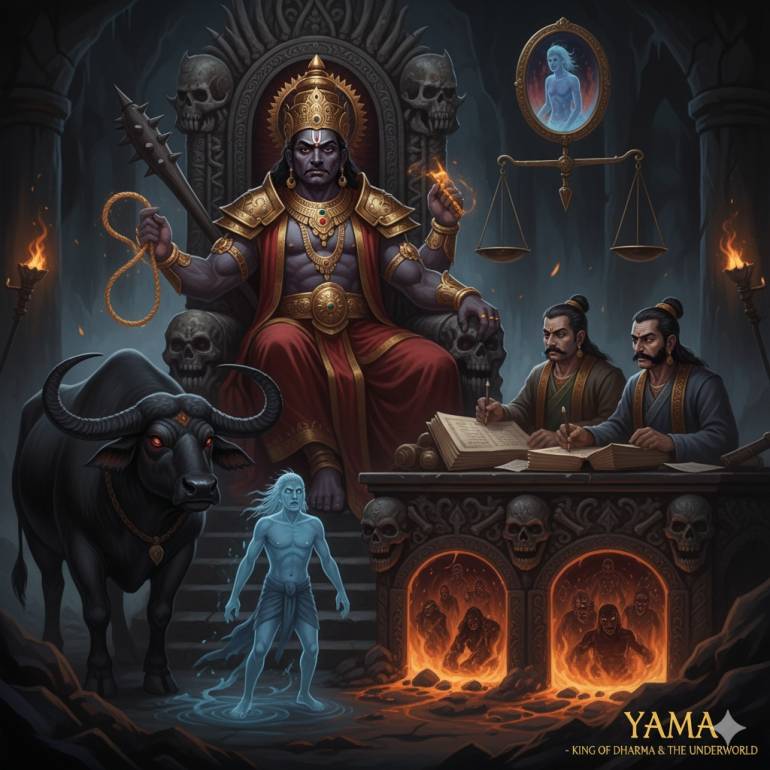 ◦ ผู้กำเนิด: ในคติฮินดู เชื่อว่า พระยม เป็นโอรสของพระอาทิตย์ (สุริยะ) และเป็นมนุษย์คนแรกที่ตาย ทำให้ท่านกลายเป็นผู้บุกเบิกและผู้ปกครองโลกแห่งบรรพบุรุษและคนตาย