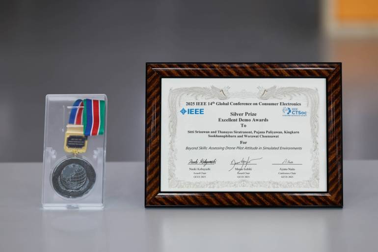 มหาวิทยาลัยกรุงเทพ ภาคภูมิใจนำเสนอความสำเร็จอีกครั้งของนักศึกษาและคณาจารย์ ด้วยผลงาน "CoSI Pilot: A VR-Based Drone Training Simulator" หรือ ระบบจำลองการฝึกนักบินโดรนด้วยเทคโนโลยีเสมือนจริง (VR) ที่ได้รับรางวัลชนะเลิศอันดับ 2 (Silver Prize) ในสาขา IEEE GCCE 2025 Excellent Demo! Awards จากงานประชุมวิชาการระดับนานาชาติ 2025 IEEE 14th Global Conference on Consumer Electronics ณ ประเทศญี่ปุ่น โดยมหาวิทยาลัยกรุงเทพเป็นสถาบันแห่งเดียวของไทยที่ได้รับเกียรติจากเวทีระดับโลกนี้
