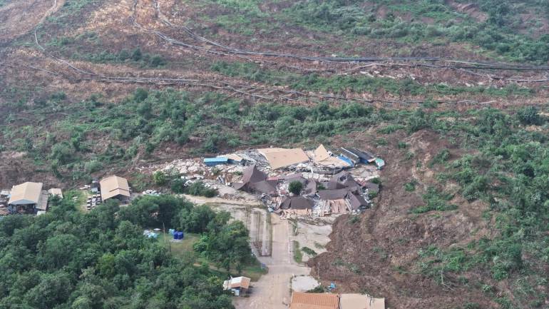 กระทั่งวันที่ 4 พฤศจิกายน 2568 เวลาประมาณ 03.00 น. พบการเคลื่อนตัวของมวลดินและเกิดดินสไลด์ ส่งผลให้อาคารสำนักงานบริษัทผู้รับจ้าง และทรัพย์สินบางส่วนได้รับความเสียหาย แต่ไม่พบผู้ได้รับบาดเจ็บและเสียชีวิตแต่อย่างใด บริเวณความเสียหายเบื้องต้นครอบคลุมพื้นที่ 1 ตารางกิโลเมตร และอยู่ระหว่างการสำรวจพื้นที่ จากการตรวจสอบสาเหตุเบื้องต้นพบว่า ตั้งแต่ช่วงวันที่ 31 ตุลาคม 2568 จนถึงวันที่ 4 พฤศจิกายน 2568 มีฝนตกต่อเนื่อง คาดว่าจะเป็นหนึ่งในสาเหตุของการเคลื่อนตัวและดินสไลด์ดังกล่าว