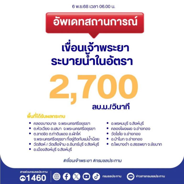 ขณะที่ ตั้งแต่เมื่อเวลา 22.00 น.วันที่ 5 พ.ย.2568 ที่ผ่านมา เขื่อนเจ้าพระยา จ.ชัยนาท ปรับเพิ่มการระบายน้ำจาก 2,600 ลบ.ม./วินาที เป็น 2,700 ลบ.ม./วินาที โดยบริหารจัดการน้ำเหนือเขื่อนเจ้าพระยา ด้วยการหน่วงน้ำไว้ด้านเหนือ พร้อมรับน้ำเข้าระบบชลประทานทั้ง 2 ฝั่ง ตามศักยภาพของคลอง เพื่อลดผลกระทบให้ได้มากที่สุด ทั้งนี้ อาจกระทบพื้นที่ท้ายเขื่อน ได้แก่ อ.สรรพยา จังหวัดชัยนาท วัดไชโย และ อ.ป่าโมก คลองโผงเผง จ.อ่างทอง อ.พรหมบุรี อ.อินบุรี และ อ.เมือง จ.สิงห์บุรี และ อ.ผักไห่ อ.เสนา และ คลองบางบาล จ.พระนครศรีอยุธยา.