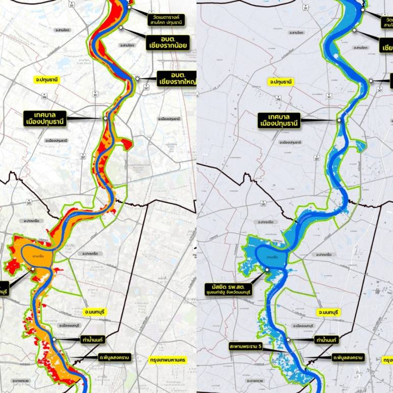 ภาพซ้ายคือการคาดการณ์ – ภาพขวาคือสถานการณ์จริง อ้างอิงข้อมูลดาวเทียมจาก https://disaster.gistda.or.th/flood : จากการเปรียบเทียบภาพแผนที่ทั้งสองด้าน พบว่า “พื้นที่สีแดงและพื้นที่สีส้ม” ซึ่ง GISTDA เคยคาดการณ์ไว้เมื่อวันที่ 8 พฤศจิกายน 2568 ว่าอาจได้รับผลกระทบจากการระบายน้ำในระดับ 2,700 – 2,800 ลูกบาศก์เมตรต่อวินาทีนั้นได้กลายเป็น “พื้นที่สีฟ้า” ตามแผนที่ ณ ปัจจุบัน (10 พฤศจิกายน 2568) ซึ่งหมายถึงน้ำท่วมจริงในพื้นที่นั้นทั้งหมด