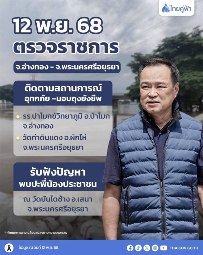 เมื่อวันที่12 พ.ย.68) นายอนุทิน ชาญวีรกูล นายกรัฐมนตรีและ รมว.มหาดไทย มีกำหนดลงพื้นที่ตรวจราชการจังหวัดอ่างทองและพระนครศรีอยุธยา เพื่อติดตามสถานการณ์น้ำท่วมในพื้นที่ภาคกลางตอนบน พร้อมรับฟังปัญหา ให้กำลังใจประชาชน และสั่งการหน่วยงานที่เกี่ยวข้องให้บูรณาการช่วยเหลืออย่างเร่งด่วน