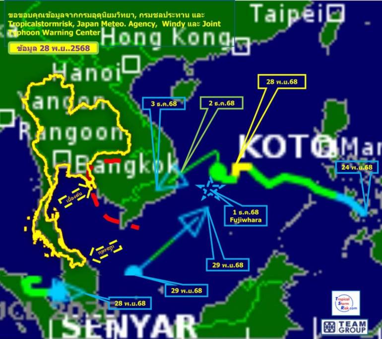 เมื่อวันที่ 29 พ.ย.68 นายชวลิต จันทรรัตน์ ประธานทีมกรุ๊ป ผู้เชี่ยวชาญเรื่องน้ำ เผยว่า พายุไต้ฝุ่น “โกโตะ” ถูกลมหนาวปะทะให้อ่อนกำลังลงเป็นพายุโซนร้อน และมีพายุดีเปรสชั่น “เซนยาร์” จากมาเลเซียเคลื่อนที่เข้ามารวมตัวแบบฟูจิวารา ทำให้ยังคงมีกำลังเป็นพายุโซนร้อนอยู่ แล้วเคลื่อนที่ต่อไปขึ้นฝั่งที่เมืองกวีเญิน เคลื่อนตัวไปสลายตัวก่อน โดยไปไม่ถึงพนมเปญ มีผลทำให้ ระยอง จันทบุรี และตราด จะมีฝนตกเพิ่มขึ้นในวันที่ 2 ถึง 3 ธ.ค.นี้