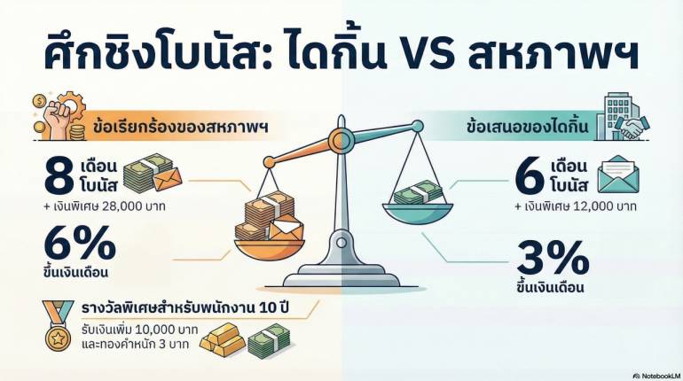 แต่ในส่วนของ บริษัท ไดกิ้น ได้เสนอ โบนัส 6 เดือน บวก 12,000 บาท ขึ้นเงินเดือน 3% โดยมีกระแสข่าวว่ามีการเสนอ เงิน 40,000 บาท แทนการให้ทองคำ 3 บาท