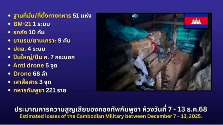 ศูนย์ปฏิบัติการกองทัพภาคที่ 2 สรุปสถานการณ์ตามแนวชายแดนไทย-กัมพูชา 13 ธ.ค.68 ที่ผ่านมา ทหารไทยยึดควบคุมเนิน 677 และ ควบคุม 4 พื้นที่ช่องคนาได้ตามแผน แม้เจอ BM-21 และโดรนพลีชีพตอบโต้ ฝ่ายกัมพูชาสูญเสียทหารไป 221 นาย รถถัง 10 คัน