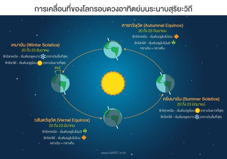 ในระยะเวลา 1 ปีที่โลกโคจรรอบดวงอาทิตย์ จะเกิดปรากฏการณ์สำคัญที่เกี่ยวข้องกับการขึ้น - ตก ของดวงอาทิตย์ทั้งหมด 4 ครั้ง ได้แก่ วันวสันตวิษุวัต (Vernal Equinox) และ วันศารทวิษุวัต (Autumnal Equinox) วันที่มีช่วงเวลากลางวันและกลางคืนยาวนานเท่ากัน วันครีษมายัน (Summer Solstice) วันที่ช่วงเวลากลางวันยาวนานที่สุด และวันเหมายัน (Winter Solstice) วันที่ช่วงเวลากลางคืนยาวนานที่สุด ผู้สนใจสามารถติดตามข้อมูลปรากฏการณ์อื่น ๆ เพิ่มเติมได้ทางเฟซบุ๊กสถาบันวิจัยดาราศาสตร์แห่งชาติ ที่ www.facebook.com/NARITpage หรือ
