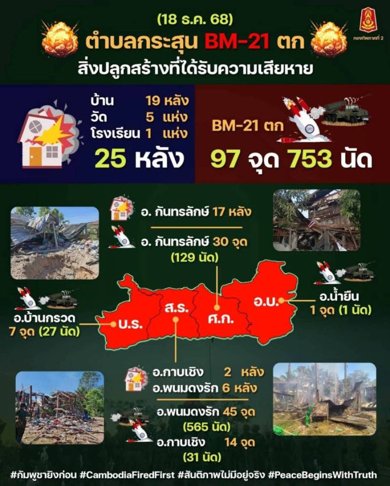 ศูนย์ปฏิบัติการกองทัพภาคที่ 2 สรุปสถานการณ์ตามแนวชายแดนไทย-กัมพูชา ประจำวันที่ 19 ธันวาคม 2568 (เวลา 12.00 น.)