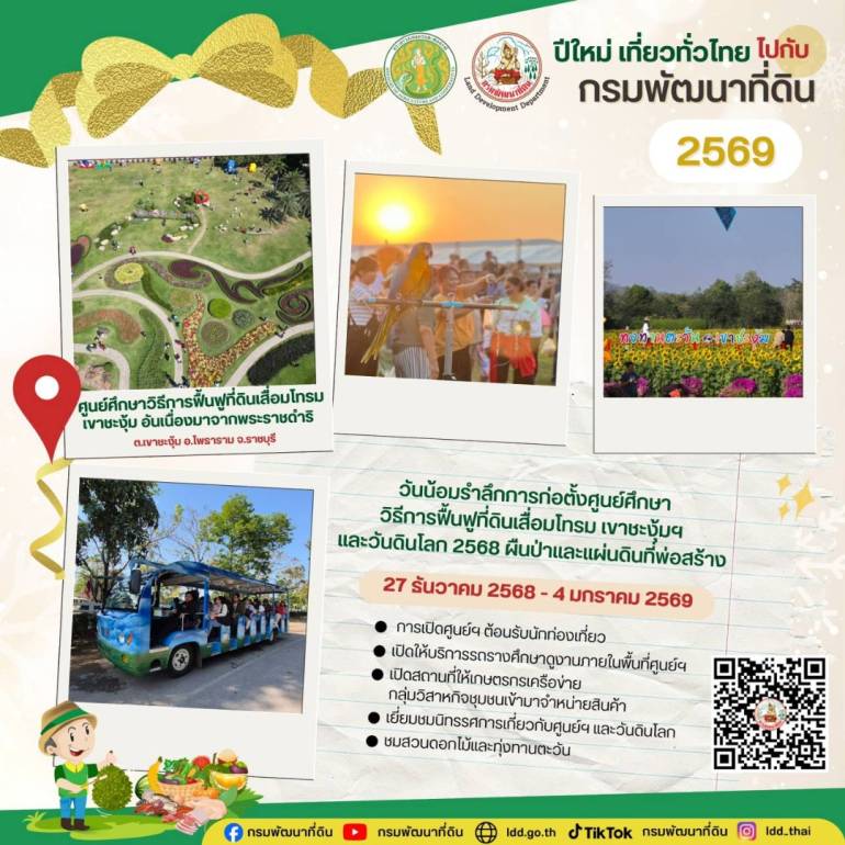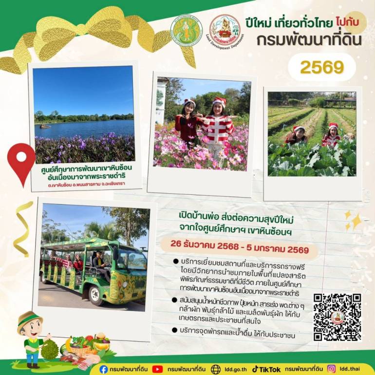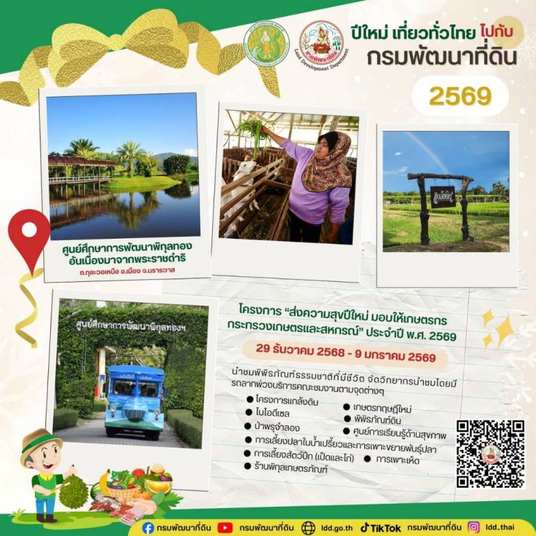 กรมพัฒนาที่ดิน ร่วมส่งความสุขปีใหม่ 2569 มอบของขวัญปีใหม่ให้พี่น้องชาวไทยและเกษตรกรทั่วประเทศ เพิ่มสุขปีใหม่ เที่ยวทั่วไทยกับ 3 ศูนย์เรียนรู้ ที่ ฉะเชิงเทรา ราชบุรี และนราธิวาส