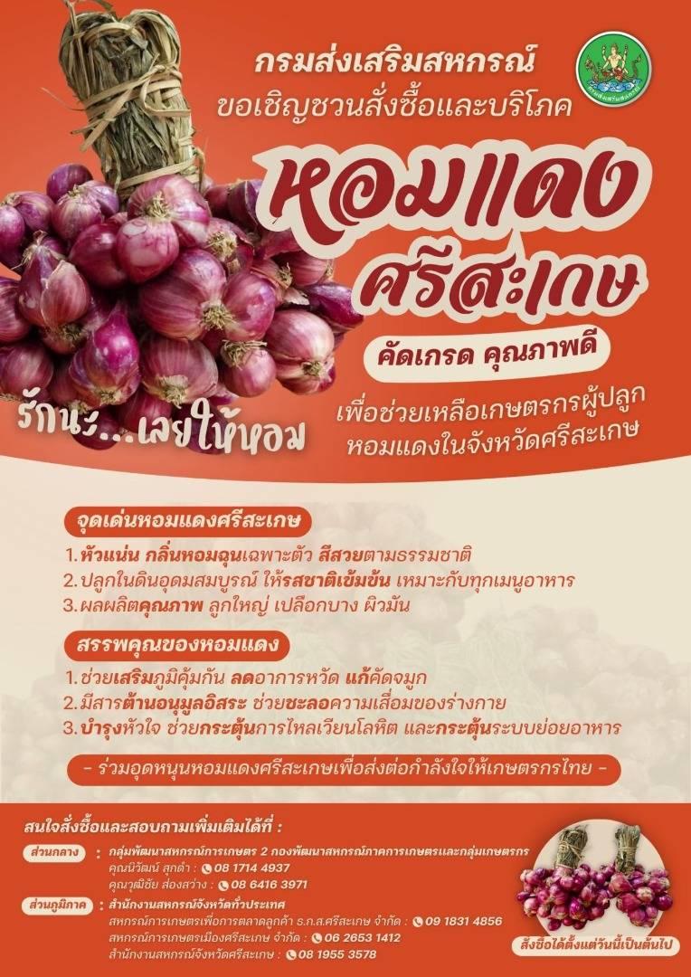 ทั้งนี้ ผู้ที่สนใจจะสั่งซื้อหอมแดงศรีสะเกษของสหกรณ์ สามารถติดต่อสอบถามได้ที่ กองพัฒนาสหกรณ์ ภาคการเกษตรเเละกลุ่มเกษตรกร กรมส่งเสริมสหกรณ์ โทร. 08 1714 4937 หรือ สำนักงานสหกรณ์จังหวัดทั่วประเทศ และสำนักงานสหกรณ์จังหวัดศรีสะเกษ โทร. 08 1955 3578 ซึ่งขณะนี้สหกรณ์ในจังหวัดศรีสะเกษ พร้อมรับคำสั่งซื้อและสามารถจัดส่งหอมแดงศรีสะเกษไปยังจังหวัดปลายทางได้ทันที.
