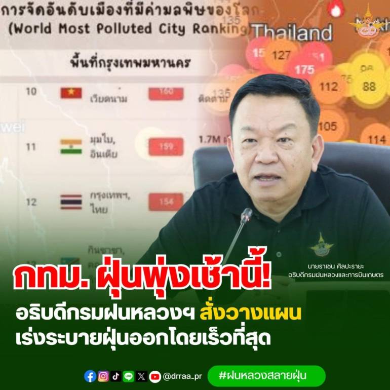 เมื่อเวลา 10.30 น.วันที่ 30 มกราคม 2569 นายราเชน ศิลปะรายะ อธิบดีกรมฝนหลวงและการบินเกษตร เปิดเผยว่า จากการติดตามสถานการณ์ฝุ่นละอองขนาดเล็ก PM2.5 บริเวณพื้นที่กรุงเทพฯ และปริมณฑล พบว่าในเช้านี้เกินค่ามาตรฐาน อยู่ในระดับส่งผลกระทบต่อสุขภาพของประชาชน ขณะที่เวลา 07.00 น. เว็บไซต์ IQAir จัดอันดับเมืองใหญ่ที่มีมลพิษมากที่สุด พบว่า กรุงเทพฯ ประเทศไทย ติดอันดับ 12 ของเมืองใหญ่ที่มีมลพิษมากสุดของโลก วัดค่าดัชนีคุณภาพอากาศ (AQI) ได้ 154 ประกอบกับในช่วงนี้ข้อมูลการระบายอากาศจากกรมอุตุนิยมวิทยา พบว่า การระบายอากาศอยู่ในระดับอ่อน ทำให้ฝุ่นยังคงสะสมอยู่ จึงสั่งการให้หน่วยดัดแปรสภาพอากาศ อ.หัวหิน จ.ประจวบคีรีขันธ์ และหน่วยดัดแปรสภาพอากาศ จ.ระยอง วางแผนระบายฝุ่นออกจากพื้นที่โดยเร็วที่สุด