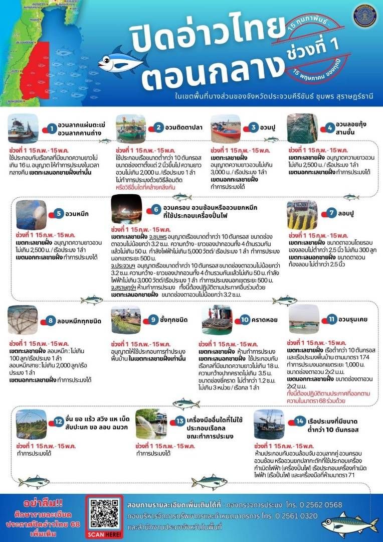 กรมประมงประกาศปิดอ่าวไทยตอนกลาง ประจำปี 2569 ครอบคลุมทะเลบางส่วนของประจวบฯ ชุมพร และสุราษฎร์ฯ โดยช่วงแรกเริ่ม 15 ก.พ.-15 พ.ค. และ ช่วงที่ 2 เริ่ม 16-พ.ค.-14 มิ.ย. เพื่อคุ้มครองพ่อแม่พันธุ์สัตว์น้ำ โดยเฉพาะปลาทู และฟื้นฟูระบบนิเวศอย่างสมดุล