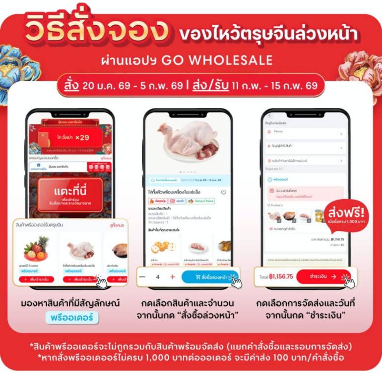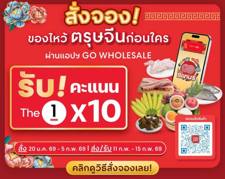 ที่สำคัญ โก โฮลเซลล์ เปิดบริการพรีออเดอร์ รับสั่งของล่วงหน้า เพิ่มความสะดวกและเตรียมความพร้อมก่อนวันไหว้ ผ่านแอปฯ GO WHOLESALE รับคะแนน The1 X10 เริ่มสั่งซื้อตั้งแต่วันนี้ถึง 5 กุมภาพันธ์ 2569 พร้อมรับสินค้าในวันที่ 11 – 15 กุมภาพันธ์ 2569 ซึ่งมีวัตถุดิบที่ใช้ในเทศกาลตรุษจีนแบบ สด ครบ คุ้ม ทั้งอาหารสด อาหารแห้ง อาหารแช่แข็ง ผัก ผลไม้ และชุดเครื่องไหว้ต่างๆ