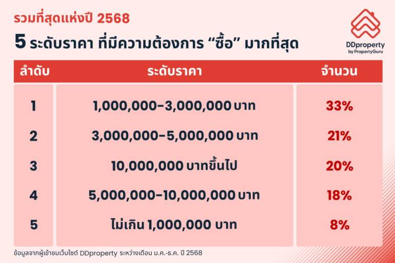 โดยระดับราคาที่อยู่อาศัยที่ชาวไทยมีความต้องการซื้อมากที่สุดในรอบปี 2568 ได้แก่