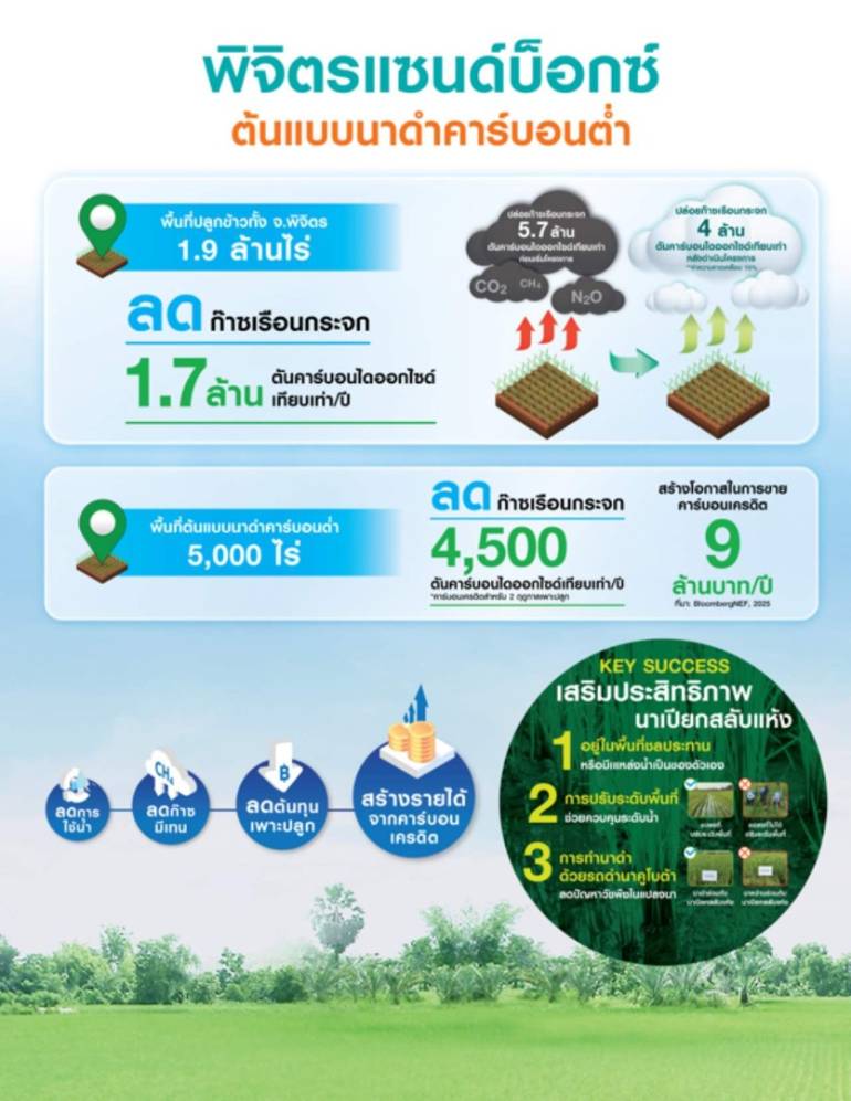 ทั้งนี้ เกษตรกรที่เข้าร่วมโครงการจะได้องค์ความรู้ เทคโนโลยี และการสนับสนุนอย่างเป็นระบบ เพิ่มโอกาสเข้าถึงตลาดข้าวคาร์บอนต่ำ เชื่อมโยงสู่ระบบรับรอง และคาร์บอนเครดิตในอนาคต เปลี่ยนจากชาวนาผู้ปลูกข้าว เป็นผู้มีส่วนช่วยลดโลกร้อน และเป็นทางรอดเพื่อแก้สมการปัญหาโลกร้อนที่ยั่งยืน อีกทั้งปัจจุบันประเทศผู้ส่งออกข้าวรายสำคัญก็ให้ความสำคัญกับการทำนาโดยคำนึงถึงสิ่งแวดล้อม ดังนั้นประเทศไทยจึงกำลังเผชิญกับความท้าทายจากการแข่งขันตลาดข้าวของโลก เราจึงไม่ควรหยุดอยู่ที่คุณภาพและปริมาณ แต่ต้องตอบโจทย์เรื่องสิ่งแวดล้อม มุ่งสู่เป้าหมาย Net Zero ปี 2050 ต่อยอดสู่การยกระดับเป็น “จังหวัดต้นแบบข้าวคาร์บอนต่ำ” ครอบคลุมพื้นที่กว่า 5,000 ไร่ และขยายผลสู่ระดับประเทศต่อไป