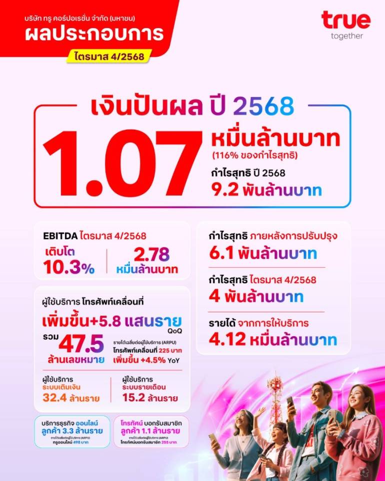 เมื่อวันที่ 19 กุมภาพันธ์ 2569 ผู้สื่อข่าวรายงานว่า บริษัท ทรู คอร์ปอเรชั่น จำกัด (มหาชน) ประกาศผลการดำเนินงานประจำไตรมาส 4/2568 โดยสามารถทำกำไรสุทธิได้ต่อเนื่องเป็นไตรมาสที่ 4 ติดต่อกัน บริษัทฯ รายงานผลกำไรสุทธิหลังหักภาษีจำนวน 4 พันล้านบาท และกำไรสุทธิหลังปรับปรุงรายการพิเศษ (Normalized Profit) จำนวน 6.1 พันล้านบาท สำหรับ EBITDA ในไตรมาสนี้อยู่ที่ 2.78 หมื่นล้านบาท สะท้อนผลประโยชน์เต็มไตรมาสจากการได้ใบอนุญาตคลื่นความถี่ ทั้งนี้ คณะกรรมการบริษัทฯ มีมติเสนอจ่ายเงินปันผลประจำปีจำนวน 4.1 พันล้านบาท ส่งผลให้เงินปันผลรวมทั้งปีอยู่ที่ 1.07 หมื่นล้านบาท คิดเป็นอัตราการจ่ายเงินปันผล 116% ของ NPAT ตามรายงาน และ 56% ของ NPAT หลังปรับปรุงรายการพิเศษ
