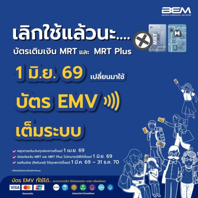 BEM และ รฟม. เตรียมพร้อมการใช้ EMV Contactless เต็มรูปแบบ ทำให้ผู้โดยสารรถไฟฟ้า MRT ไม่สามารถใช้บัตรเติมเงิน MRT และ MRT Plus ได้ตั้งแต่ 1 มิ.ย.69 นี้ โดยสามารถนำบัตรไปเปลี่ยนที่ห้องตั๋วทุกสถานี หรือ ขอเงินคืนตั้งแต่ 1 มี.ค.69 เป็นต้นไป
