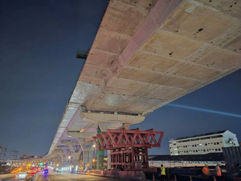 ขณะที่ตอนที่ 7 แม้จะสามารถคืนผิวจราจร ถ.พระราม 2 ทางราบในช่วงกลางวันเป็นการชั่วคราวแล้ว แต่ในส่วนงานโครงสร้างยกระดับยังมีงานติดตั้ง Segment ในส่วนที่เหลืออีกไม่มาก จำเป็นต้องดำเนินการให้แล้วเสร็จ ปัจจุบันอยู่ระหว่างกระบวนการจะเข้าทำการทดสอบความแข็งแรงของโครงสร้าง (Load Test) อย่างละเอียด เพื่อประเมินความพร้อมและมาตรฐานความปลอดภัย พร้อมทั้งการเตรียมทางเบี่ยงการจราจร ก่อนที่จะเริ่มยกติดตั้ง Segment ในส่วนที่เหลือตามขั้นตอนต่อไป
