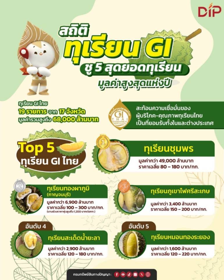 กรมทรัพย์สินทางปัญญา ความสำเร็จในการเพิ่มมูลค่าให้กับผลไม้ไทย โดยเฉพาะทุเรียนที่ ขึ้นทะเบียน GI รวมแล้ว 19 รายการจาก 17 จังหวัดทั่วไทย สร้างมูลค่าทางการตลาดกว่า 6.8 หมื่นล้านบาท สะท้อนความเชื่อมมั่นผู้บริโภค คัดมาท็อปไฟว์ที่ต้องลองกิน
