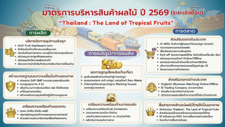 สถานการณ์ภาพรวมผลผลิตผลไม้ของไทยปี 2569 กระทรวงเกษตรและสหกรณ์คาดว่าผลผลิตรวมของผลไม้เศรษฐกิจสำคัญ ได้แก่ ทุเรียน ลำไย สับปะรด มะม่วง มังคุด ส้มเขียวหวาน เงาะ ลองกอง ลิ้นจี่ และอื่นๆ จะมีปริมาณรวมประมาณ 6.91 ล้านตัน เพิ่มขึ้นจากปี 2568 ร้อยละ 5.8 หรือเพิ่มขึ้นราว 0.379 ล้านตัน สะท้อนแนวโน้มการขยายตัวของพื้นที่เพาะปลูกและสภาพอากาศที่เอื้ออำนวยต่อการออกผล โดยเฉพาะทุเรียนซึ่งยังคงเป็นผลไม้หลักของประเทศ คาดว่าปีนี้จะมีผลผลิตรวม 1.89 ล้านตัน เพิ่มขึ้นจากปีก่อนร้อยละ 21 หรือประมาณ 330,000 ตัน ซึ่งหน่วยงานที่เกี่ยวข้องได้เร่งเตรียมมาตรการบริหารจัดการด้านการผลิต การตลาด และการกระจายผลผลิตอย่างใกล้ชิด เพื่อรองรับปริมาณผลผลิตที่เพิ่มขึ้นและรักษาเสถียรภาพราคาในช่วงฤดูกาลผลผลิตออกสู่ตลาดจำนวนมากตาม 8 มาตรการดังกล่าว