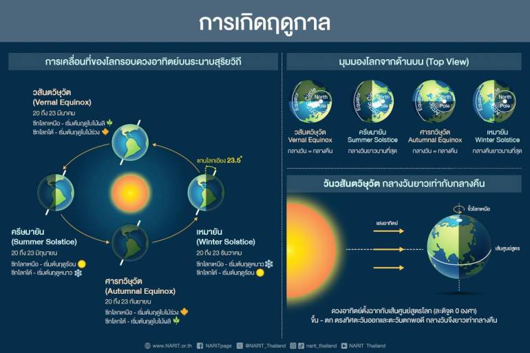 นายศุภฤกษ์ กล่าวอีกว่า “ฤดูกาล” บนโลกนั้น เกิดจากแกนโลกเอียงทำมุม 23.5 องศา