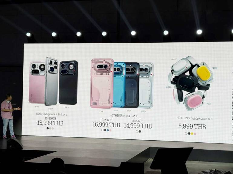 สำหรับราคาของสมาร์ทโฟน Nothing รุ่น Phone (4a) Pro (12+256GB) ราคาเปิดตัว 18,999 บาท มี 3 สี ขาว-ดำ-ชมพู Phone (4a) (12+256GB) ราคา 16,999 บาท และ (8+256GB) ราคา 14,999 บาท มีให้เลือก 4 สี ขาว-ดำ-ชมพู-น้ำเงิน Headphone (a) 5,999 บาท สี ขาว-ดำ-ชมพู และมีสีเหลือง Limited Edition ที่ต้องจับตารอเข้าไทย
