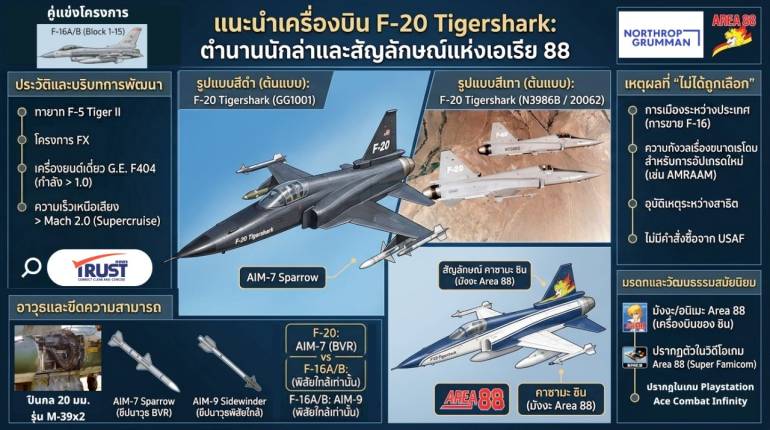 จำได้ไหม? เครื่องบินลายสีน้ำเงิน-ขาว มีรูป "ยูนิคอร์น" ที่หาง มันคือ F-20 Tigershark ที่ลุงแมคคอยหามาให้ชิน คาซามะใน AREA88 แต่ในโลกความจริงมัน "ดีเกินไป" ไม่มีใครเอา นี่คือเจ็ตขับไล่ที่โลกเกือบจะลืม แต่กลับเป็น DNA ให้กับ Gripen และ Ching-kuo ในเวลาต่อมา