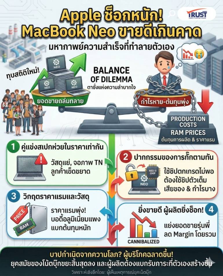 ใครจะคิดว่ายักษ์ใหญ่อย่าง Apple จะต้อง "ระทม" กับความสำเร็จ? มหากาพย์ความสำเร็จที่ทำลายตัวเองของ Apple กำลังเกิดขึ้นกับ MacBook Neo ที่ขายดีถล่มทลายในปี 2026 เมื่อ เมื่อ Apple ที่เป็นจอมกั๊กสเปกลอง "ใจป้ำ" ดูสักครั้ง ผลลัพธ์กลับกลายเป็นบาปที่ตามหลอน