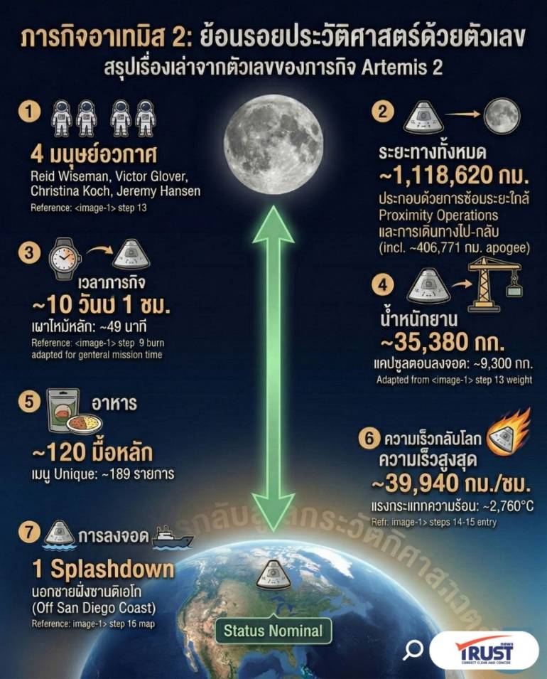 "ตัวเลขเหล่านี้ไม่ใช่แค่สถิติในหน้ากระดาษ แต่คือหลักฐานของขีดความสามารถที่มนุษย์พยายามก้าวข้ามขีดจำกัดเดิมในยุคอะพอลโลเมื่อกว่า 50 ปีกอ่น จาก 120 มื้ออาหาร การขับถ่ายด้วยสุขาไฮเทค การนอนในถุงนอน ทั้งหมด คือ การเดินทางนับล้านกิโลเมตร... Artemis II คือบทพิสูจน์ว่า วันนี้เราพร้อมแล้วสำหรับการกลับไปสร้างบ้านหลังที่สองบนดวงจันทร์อีกครั้ง.