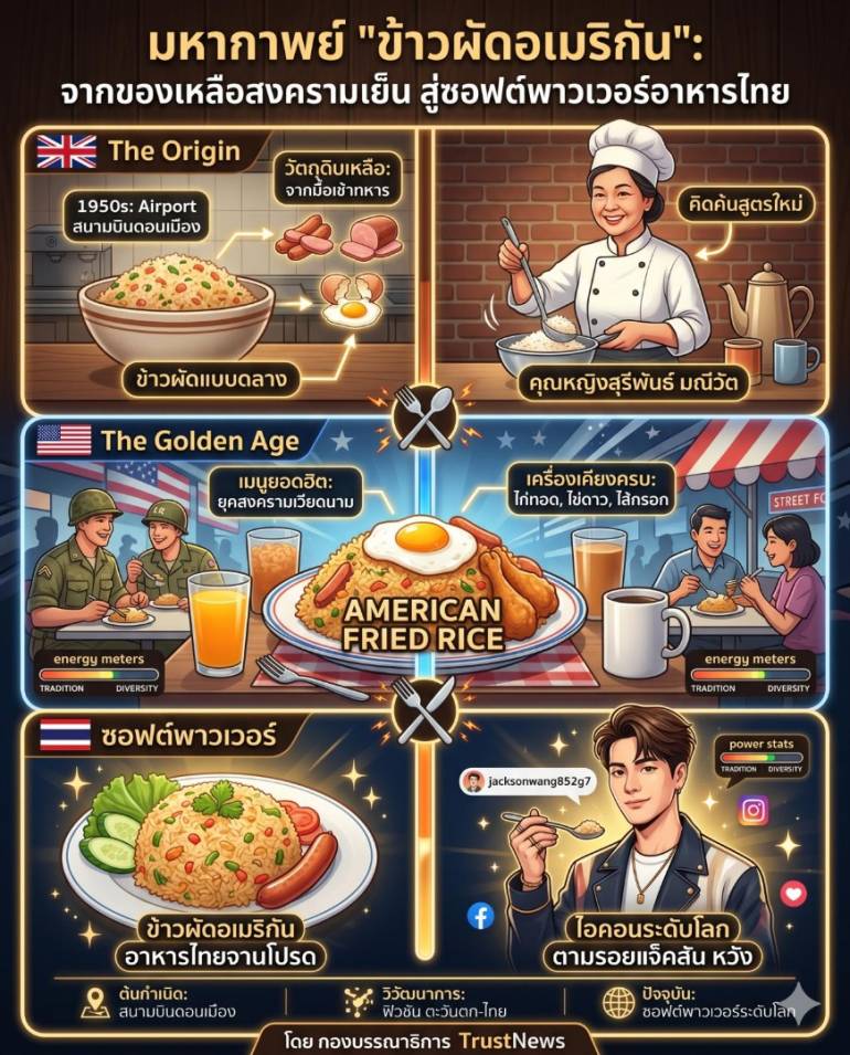 ข้าวผัดอเมริกันที่เกิดจากความบังเอิญ คือ 'บันทึกประวัติศาสตร์ที่กินได้' เกิดขึ้นในยุค 50 ช่วงสงครามเย็นที่สนามบินดอนเมือง ก่อนจะแปรสภาพจากเมนู 'แก้ปัญหาของเหลือ' สู่สัญลักษณ์แห่งการมาเยือนของวัฒนธรรมตะวันตก และกลายเป็นซอฟต์พาวเวอร์ที่ไม่เคยล้าสมัย