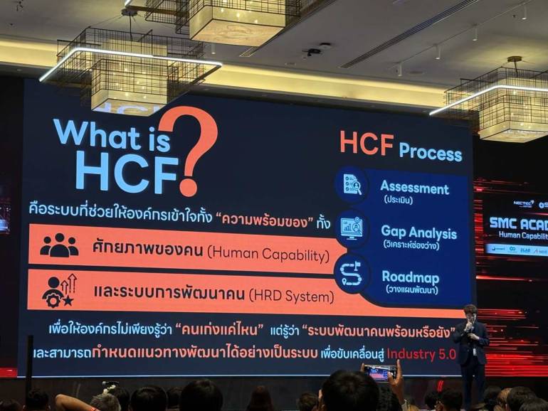 หัวหน้าโครงการ SMC ACADEMY กล่าวอีกว่า นอกจากนั้น มีการนำเสนอทั้งแนวทางการใช้งานจริงในโรงงาน ตั้งแต่การประเมินเชิงลึก (Deep Assessment) ไปจนถึงการประเมินด้วยตนเอง (Self-Assessment) ครอบคลุมบุคลากรทุกระดับ และการนำผลไปใช้ในการวางแผนพัฒนาบุคลากรอย่างเป็นรูปธรรม พร้อมกันนี้ ยังได้ถ่ายทอดทิศทางการพัฒนา HCF ในระยะต่อไป เพื่อยกระดับสู่แพลตฟอร์มข้อมูลกำลังคนภาคอุตสาหกรรม ที่สามารถเชื่อมโยงข้อมูลระหว่างสถานประกอบการ ภาคการศึกษา และหน่วยงานภาครัฐ สนับสนุนการสร้าง Benchmark ด้านศักยภาพบุคลากร และช่วยให้การตัดสินใจเชิงนโยบายด้านกำลังคนของประเทศมีความแม่นยำมากยิ่งขึ้น